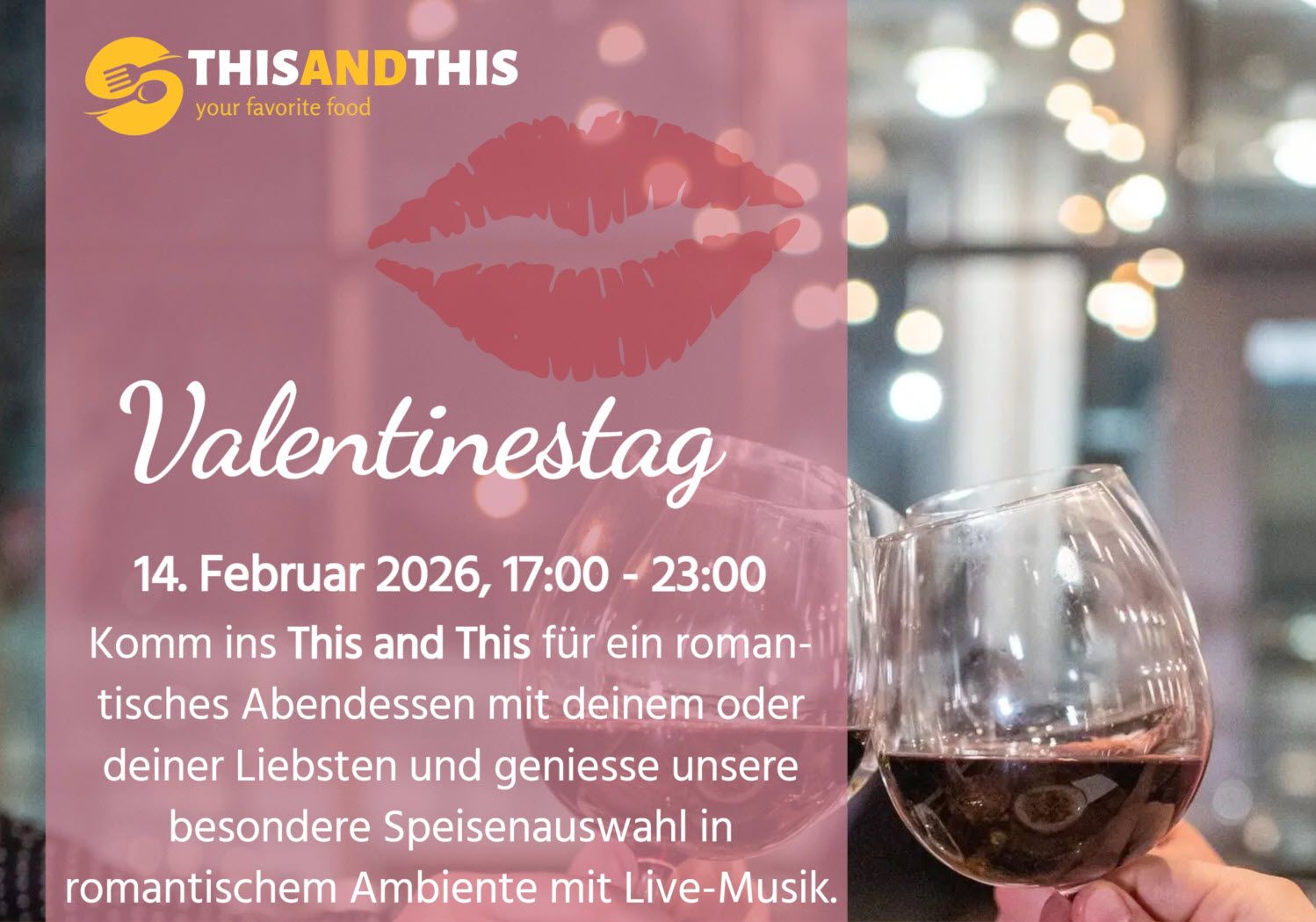 Komm am 14. Februar ins This and This für ein romantisches Abendessen mit deinem oder deiner Liebsten und geniesse unsere besondere Speisenauswahl in romantischer Atmosphäre mit unserer Live-Musik.